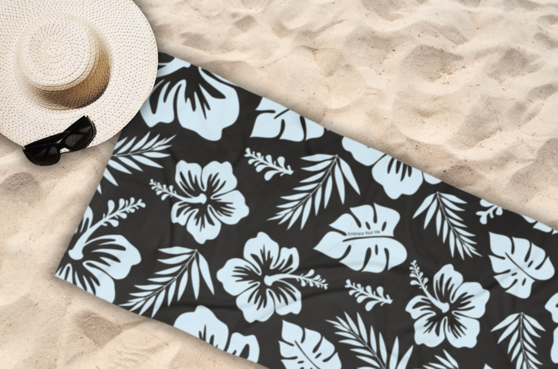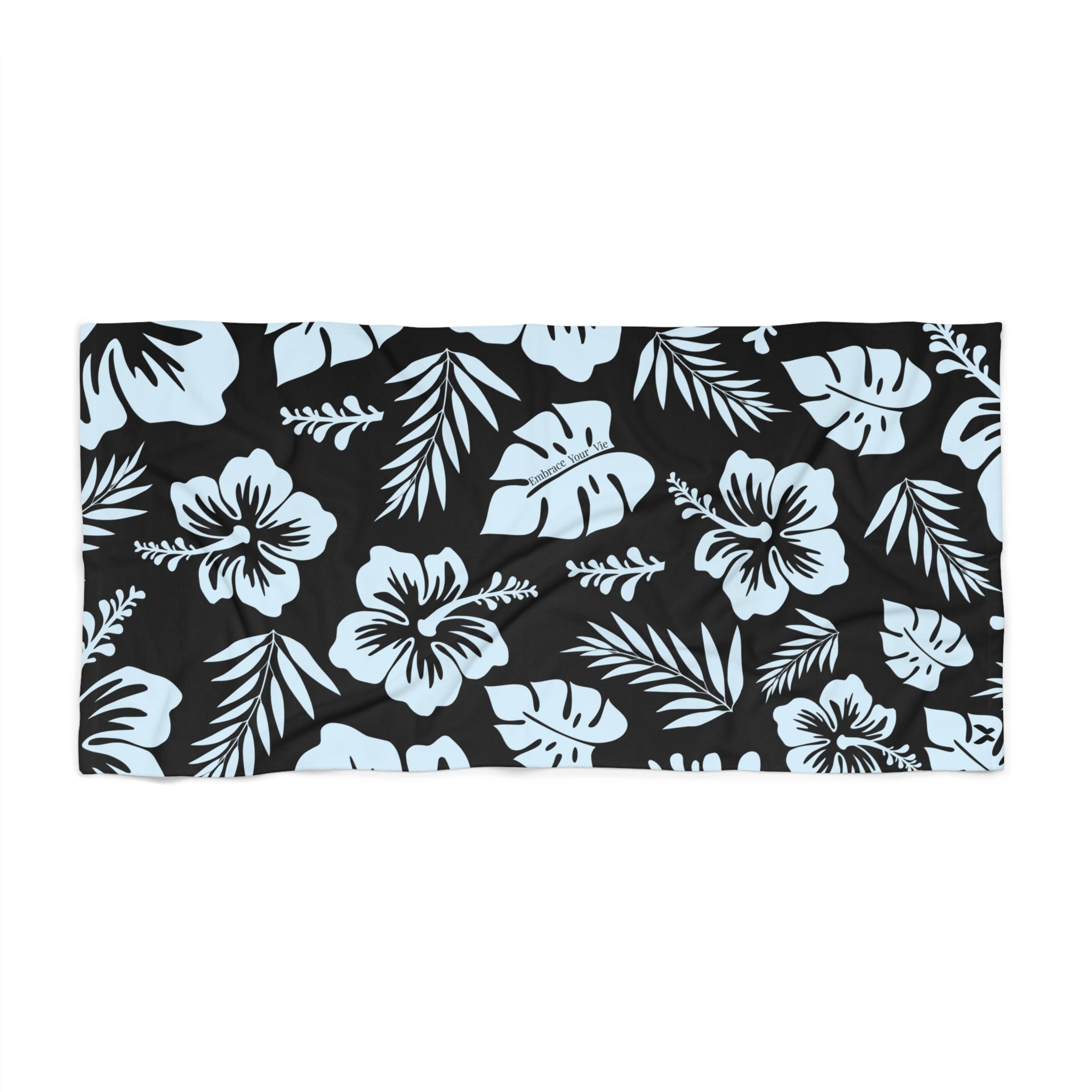 Turn heads on your next beach day with the Noir Bay Beach Towel, perfectly designed to pair with our Twilight Splash Bikini. Featuring a bold tropical print of sky-blue hibiscus flowers and palm leaves on a deep black backdrop, this luxury beach towel is as eye-catching as it is functional.