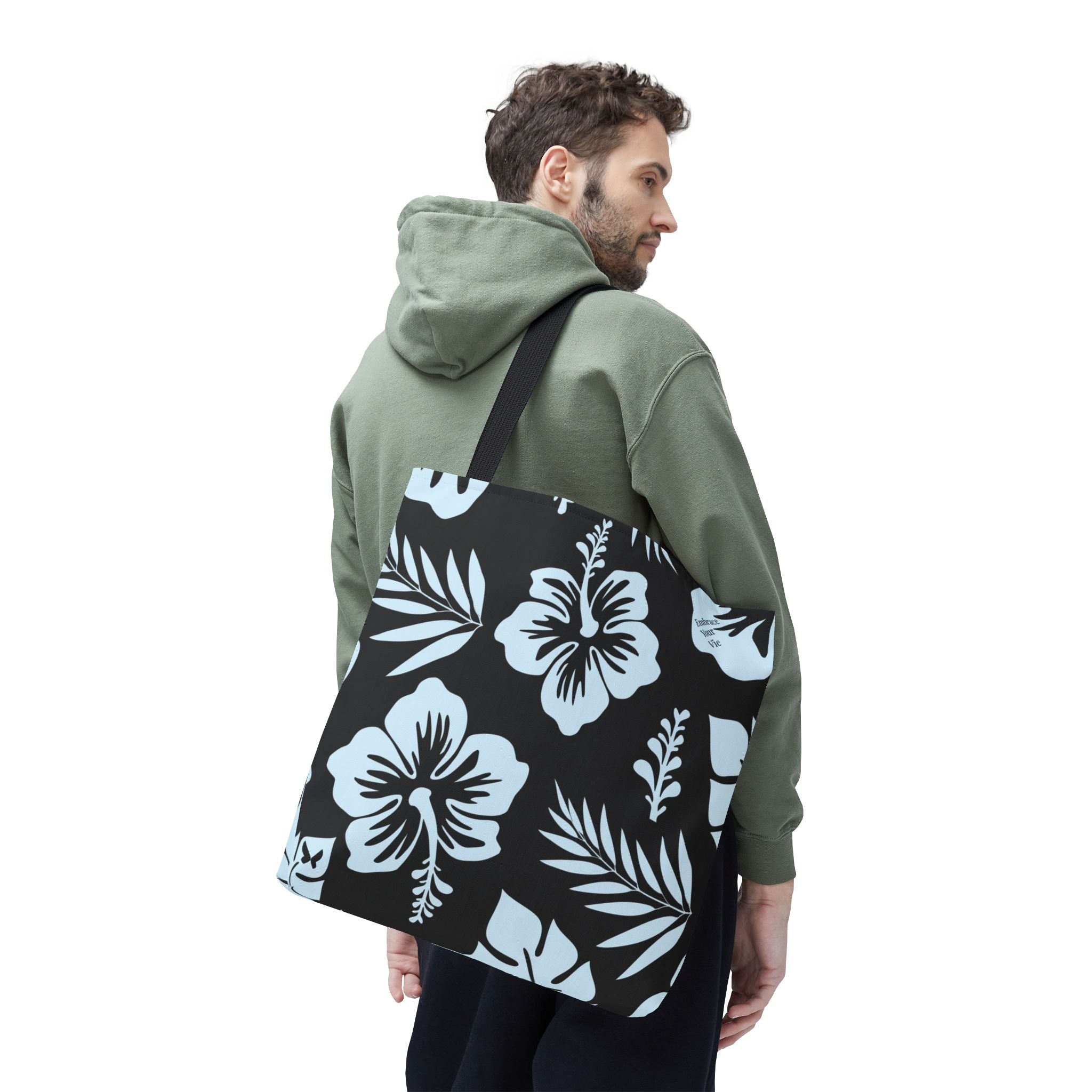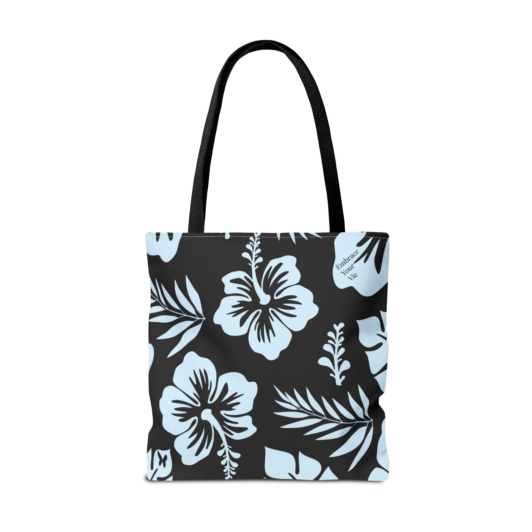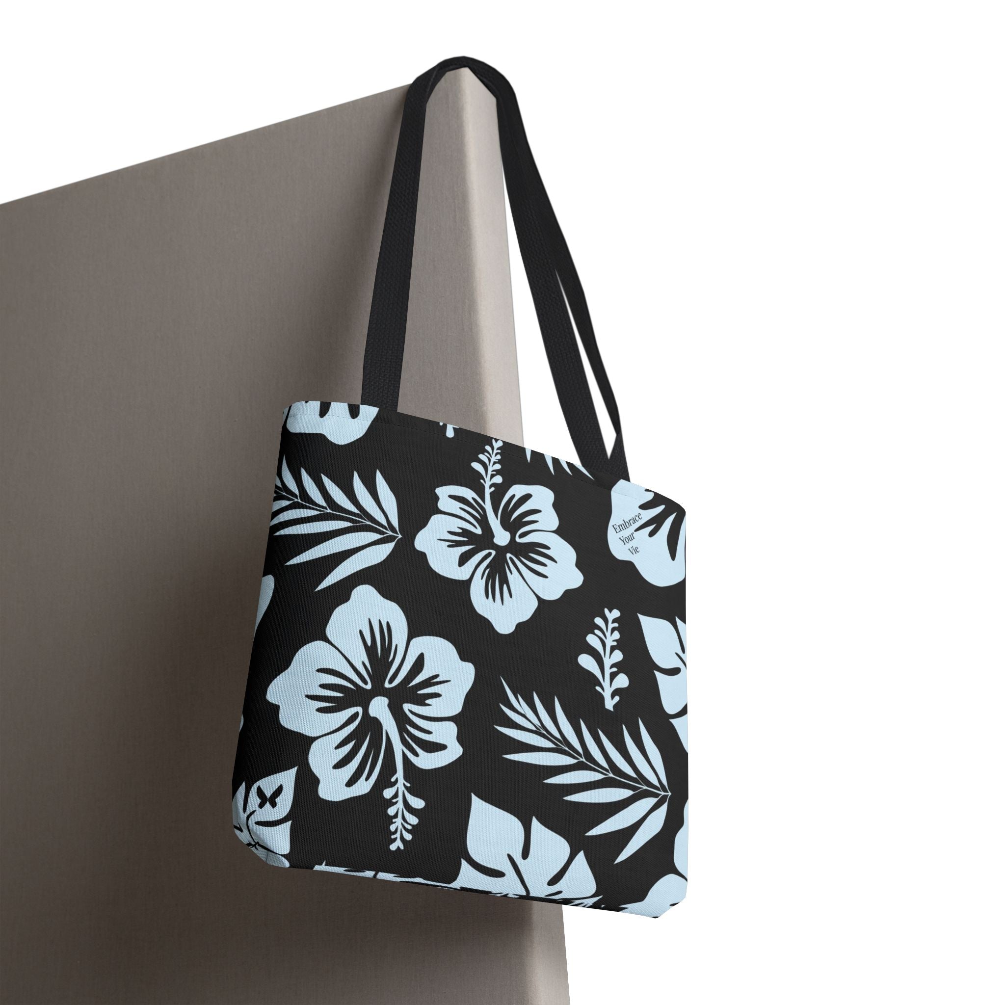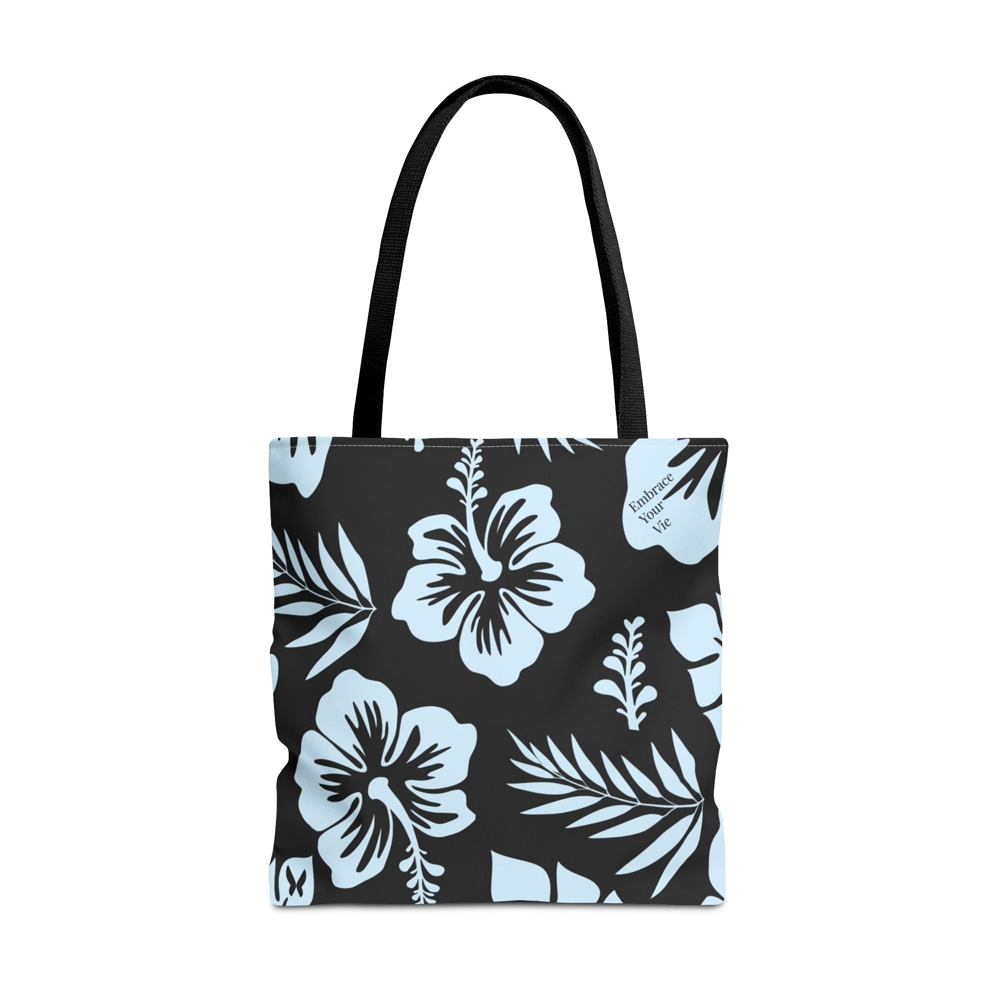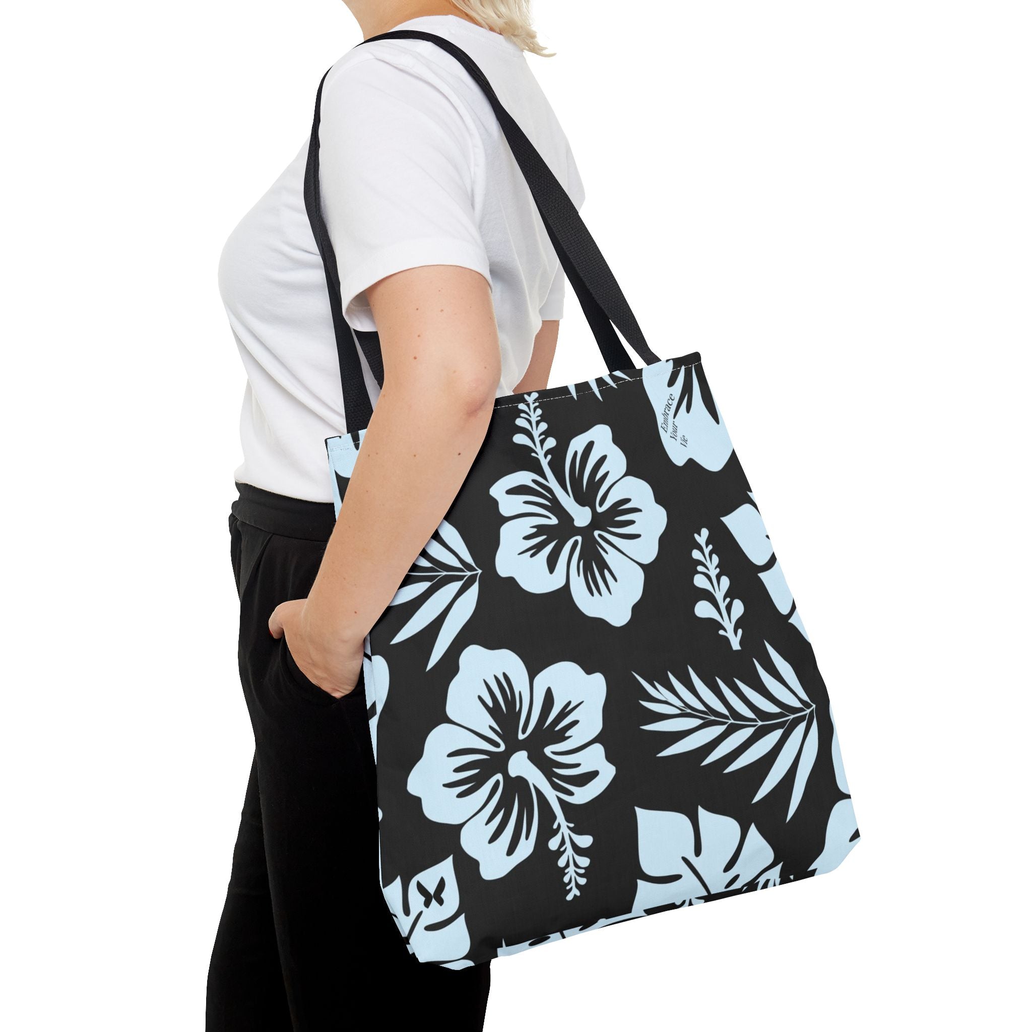 Complete your beach day look with the Noir Bay Tote Bag, the perfect companion to our Noir Bay Beach Towel and Twilight Splash Bikini. Featuring the same striking tropical print of sky-blue hibiscus flowers and palm leaves on a deep black backdrop, this stylish tote brings high-impact visuals and everyday functionality together in one must-have accessory.