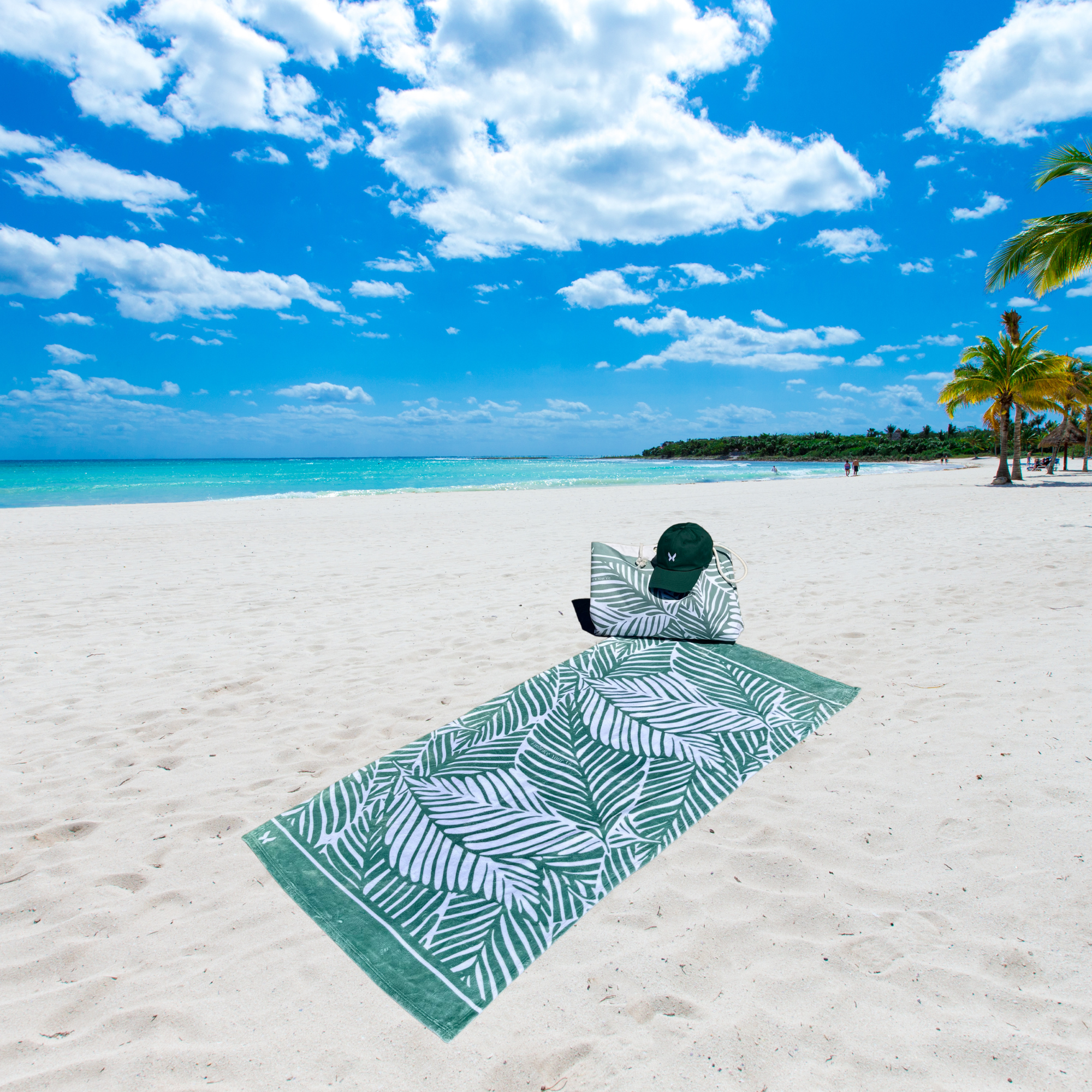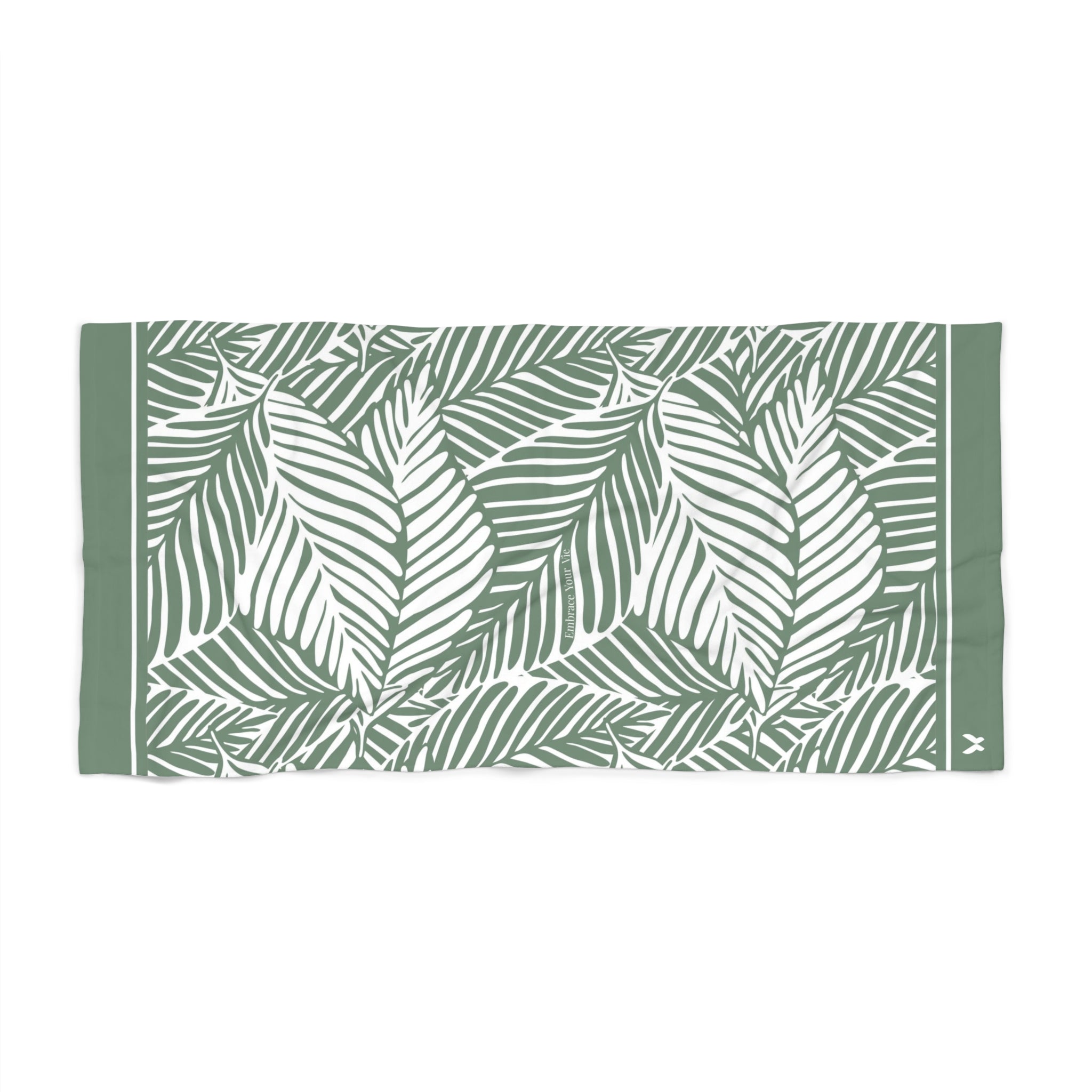 Turn heads on your next beach day with the Tropic Verde Beach Towel, perfectly designed to pair with our Agave Bay Bikini. Featuring oversized palm leaves in striking army green and white, this luxury beach towel is as eye-catching as it is functional.